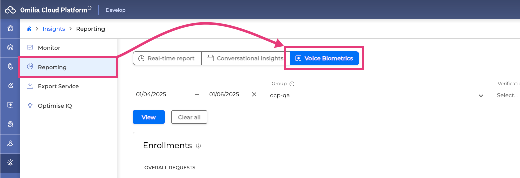 To access Voice Biometrics Reporting, navigate to the Voice Biometrics tab in Reporting.