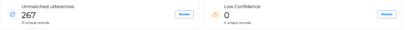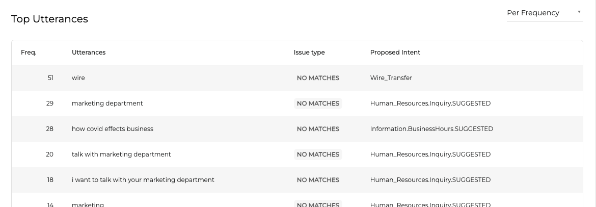 The numbers indicate both the impact of no matches as well as the unique records identified.Top Utterances - These are the top utterances that could not be related to an intent. User utterances are sorted based on frequency, or alphabetical.