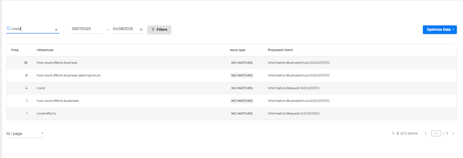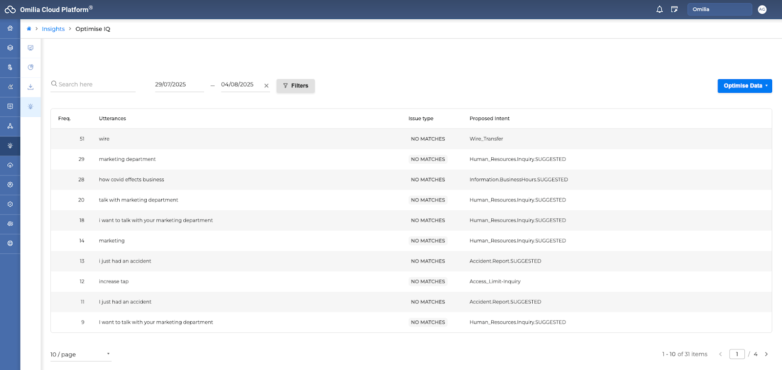 Optimise IQ allows users to view aggregated and processed results that failed to be recognised completely by the virtual agent, during an open question or a disambiguation question.