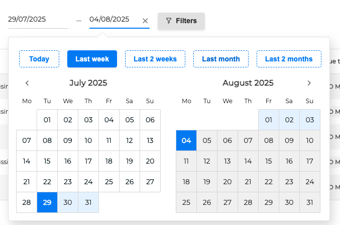 Users may navigate up to 2 months of historical data, assessing the impact of each potential intent expansion. Select a specific date range or any of the prefixed ones for example, Last month.