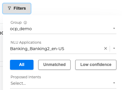 In order for NLU to receive data an NLU Application should be selected first from the Filters menu.