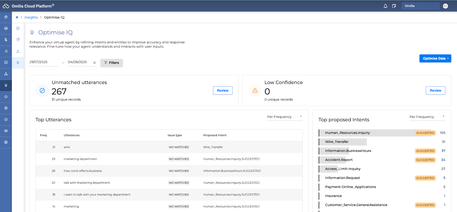 Optimise IQ marks the next era of analytics within the OCP® ecosystem. This new capability is designed to empower OCP® users to continuously improve their conversational applications by leveraging insights directly from within the OCP® environment. While performance metrics and KPIs are already available, the current process of analyzing data, identifying improvement opportunities, and implementing changes is highly manual and time-consuming. Optimise IQ addresses this gap by providing a set of interactive, graphical reports that highlight potential enhancements—such as updating existing intents or introducing new ones—based on real user interactions and application performance. These insights will be directly linked to actionable steps within other OCP components, creating a seamless and integrated workflow. Fully embedded in the OCP® Console, Optimise IQ offers a unified and data-driven approach to application optimization throughout the development lifecycle.