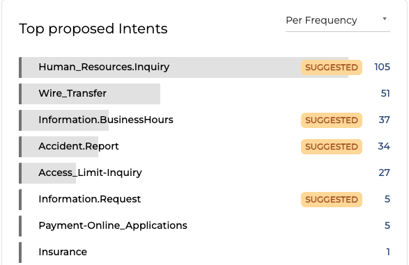 Top Proposed Intents - The proposed intents can derive from existing identified intents, or new intents may be “SUGGESTED” as potential application enhancement. Top proposed Intents are sorted based on frequency, in order to assess impact, or alphabetical if the user wishes to explore.