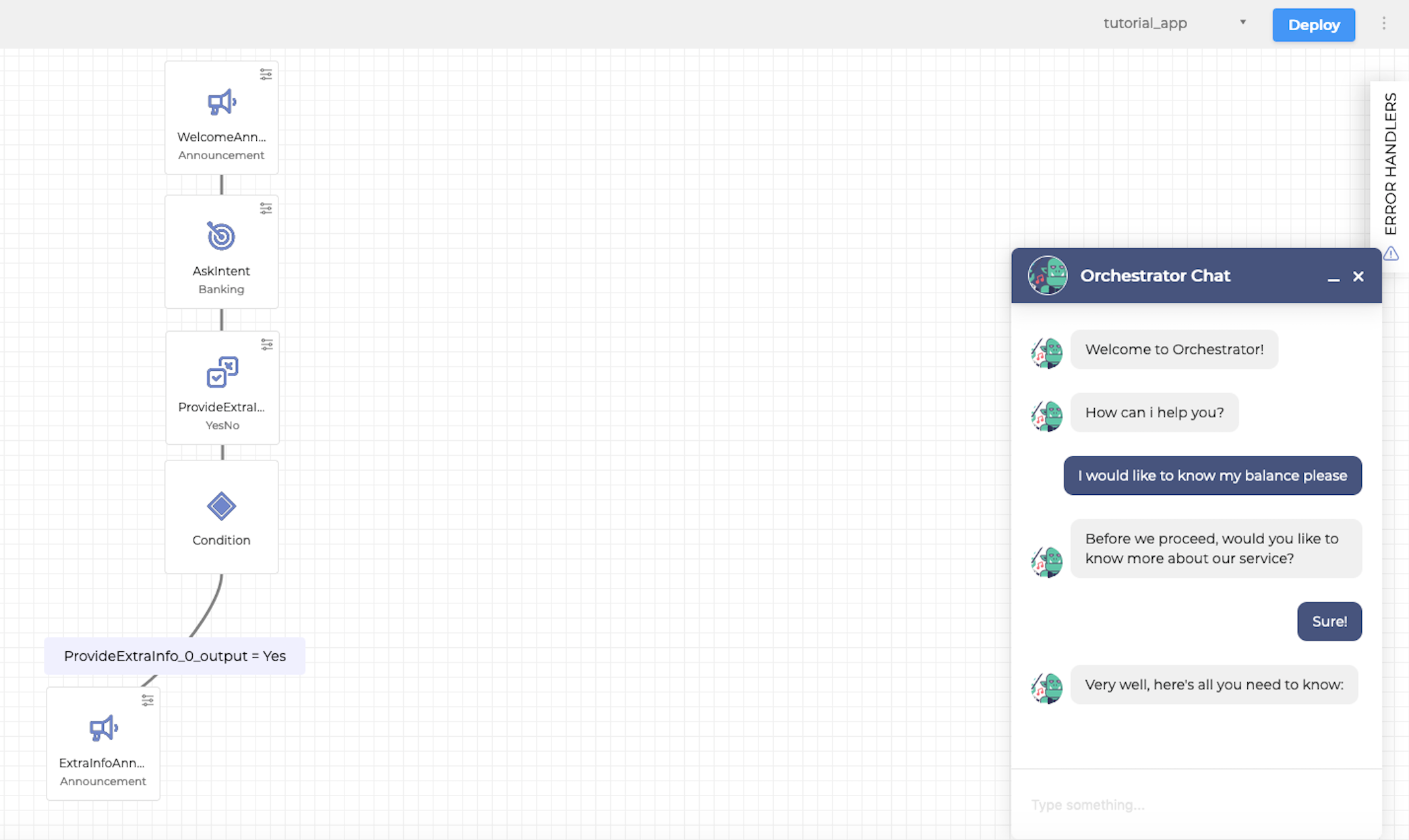 A chat bot is available to test a deployed Dialog Application.