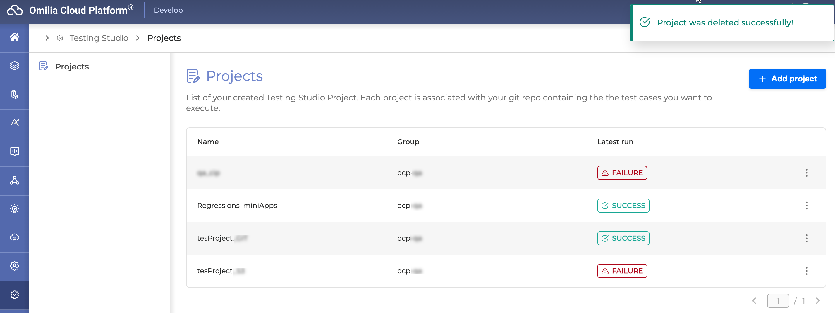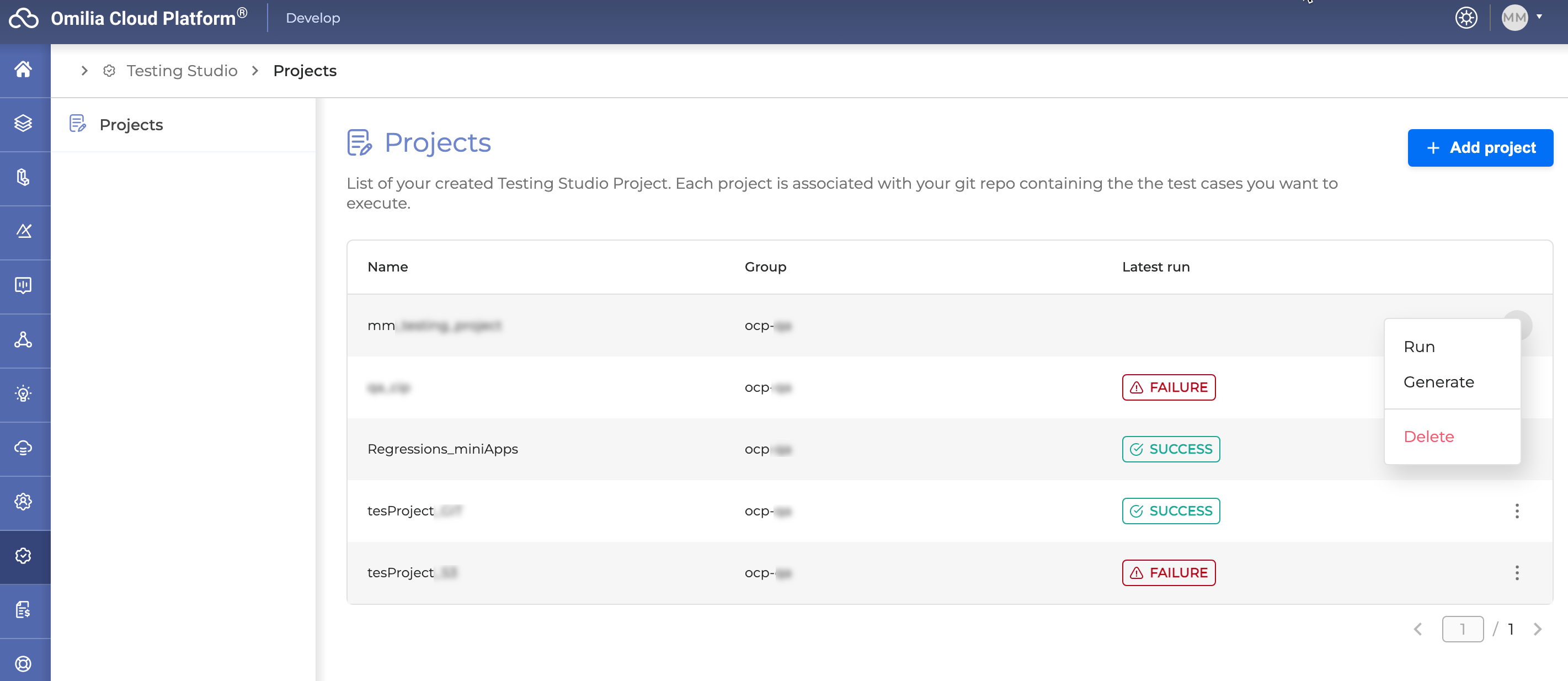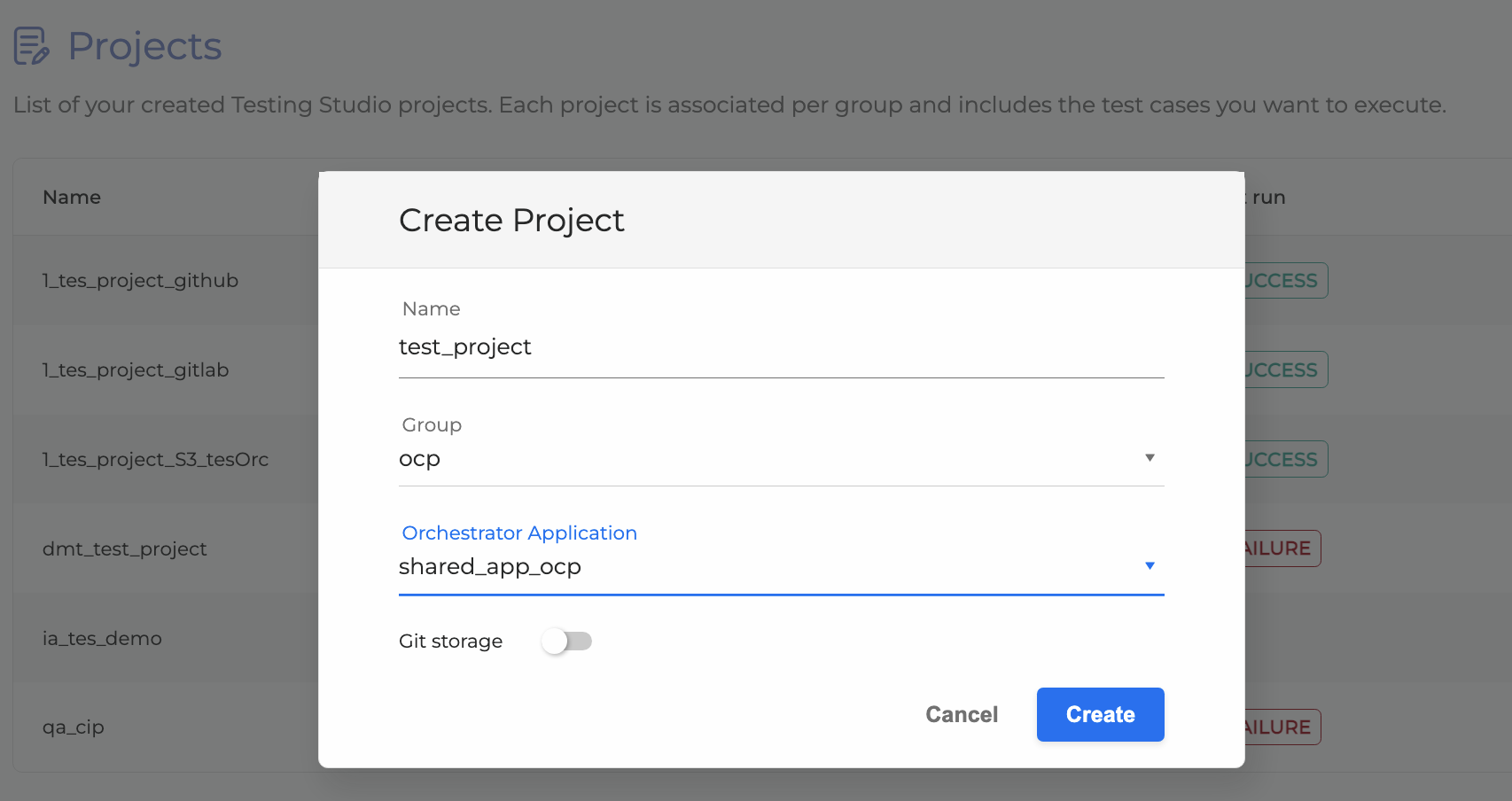 Projects page shows a list of all the created projects. A project is a remote repository where test cases reside.