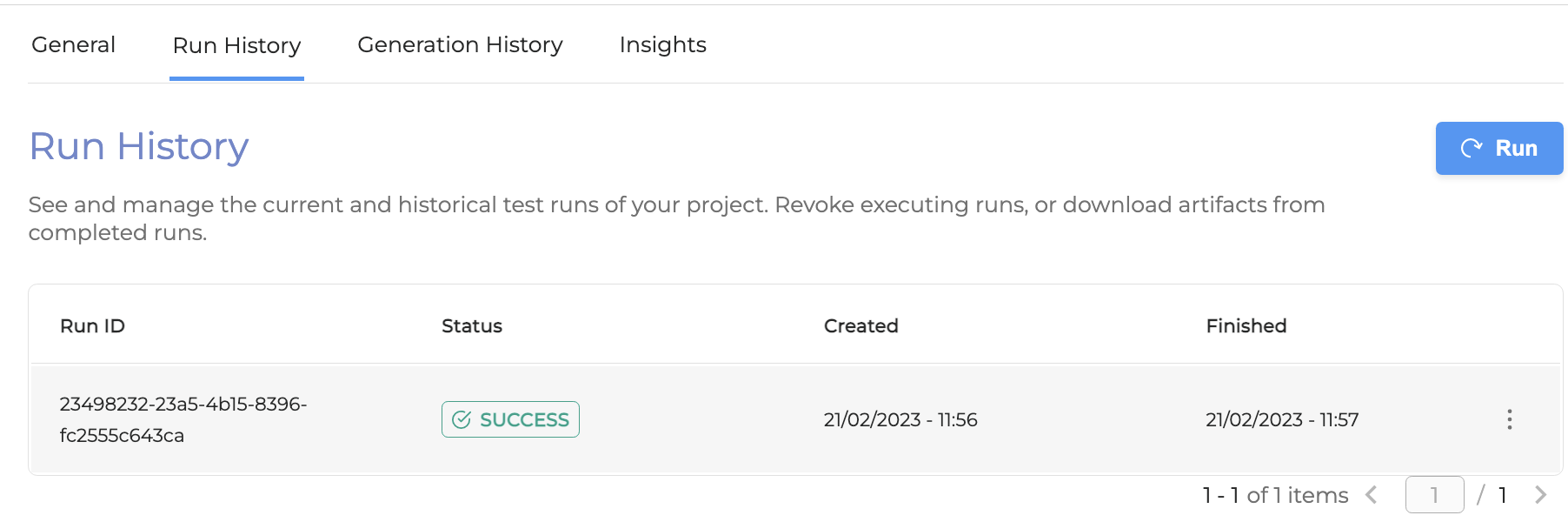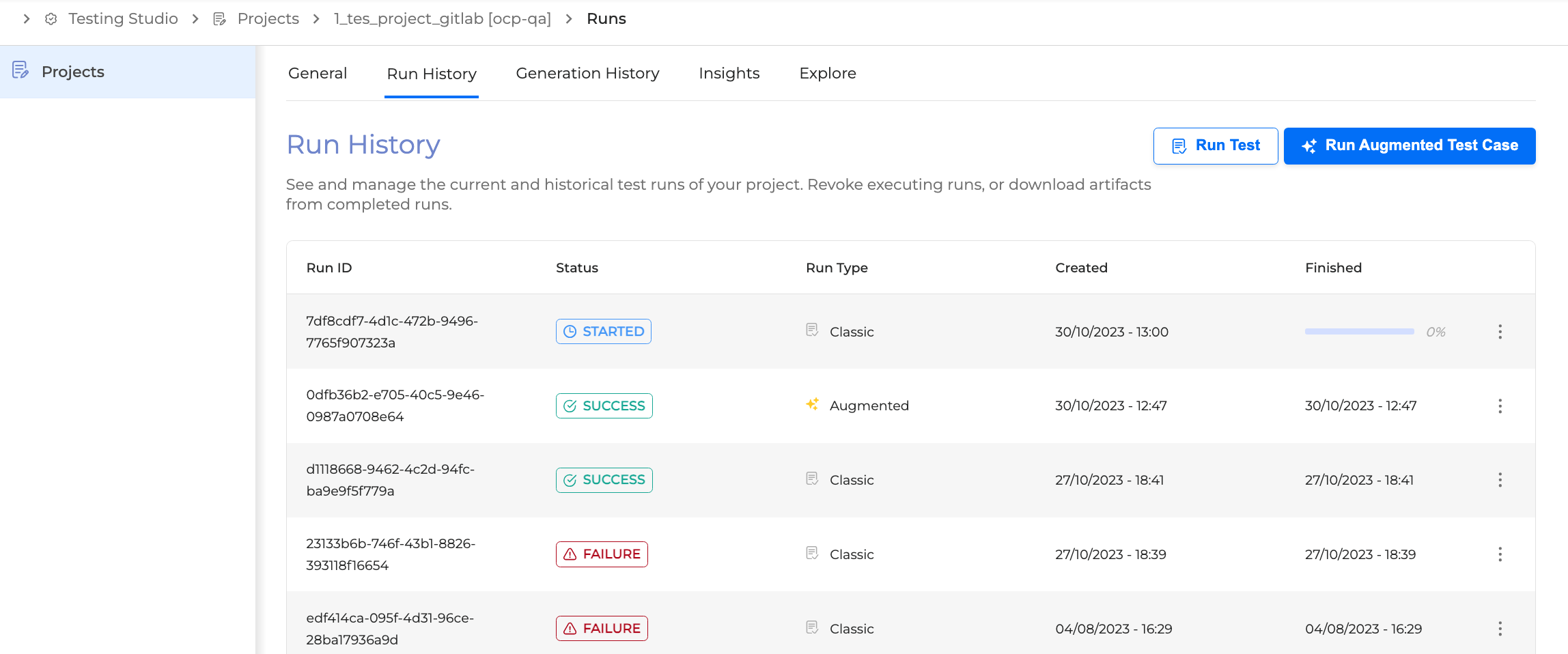 The Generation History displays the current and historical test case generations of your project. It allows you to download your generated test cases and add them to your test suites.