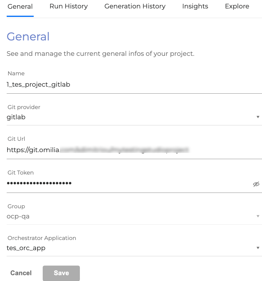 Git URL: The URL of the remote repository with tests. Omilia currently uses GitLab