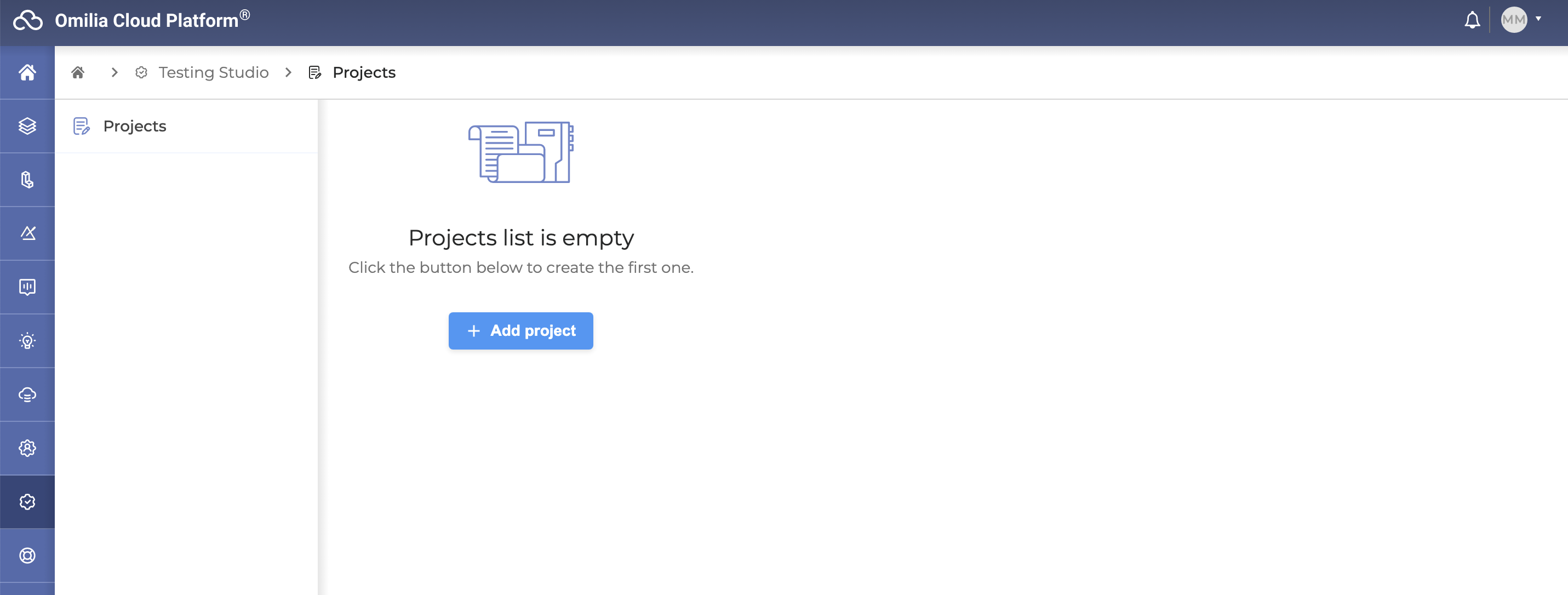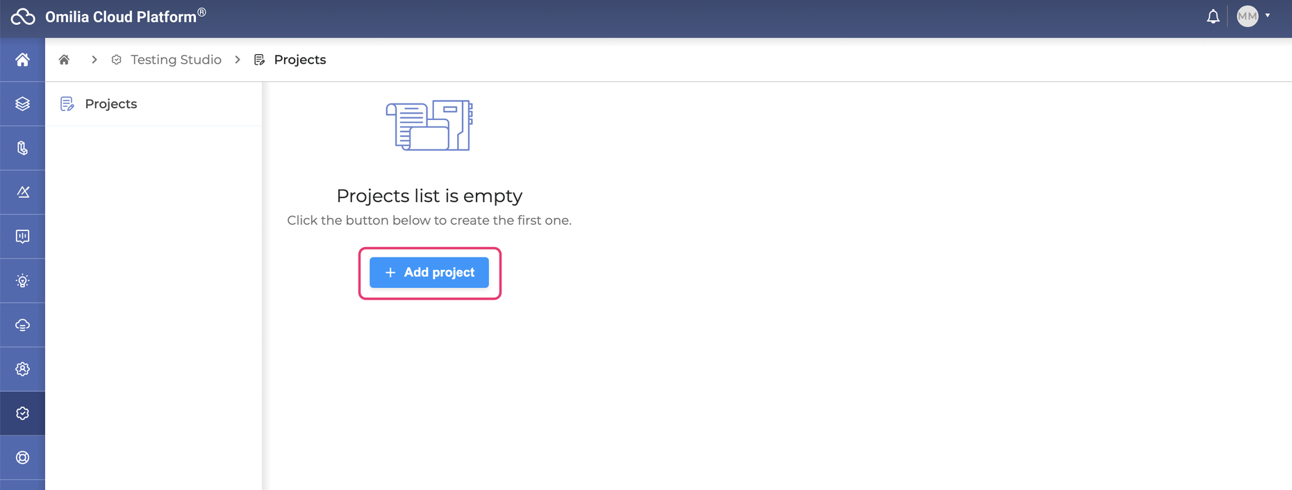 At your first login to Testing Studio+, the Projects page is empty and looks as follows:
