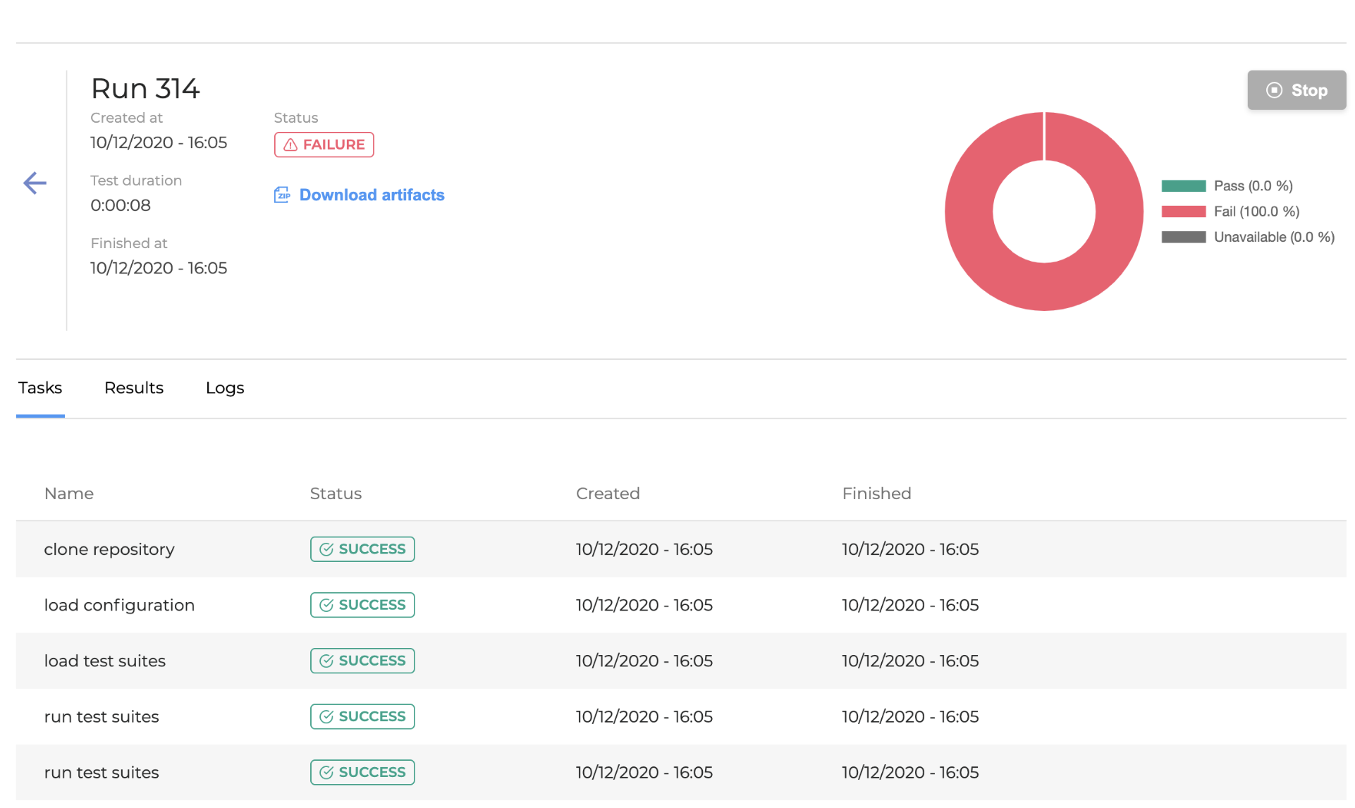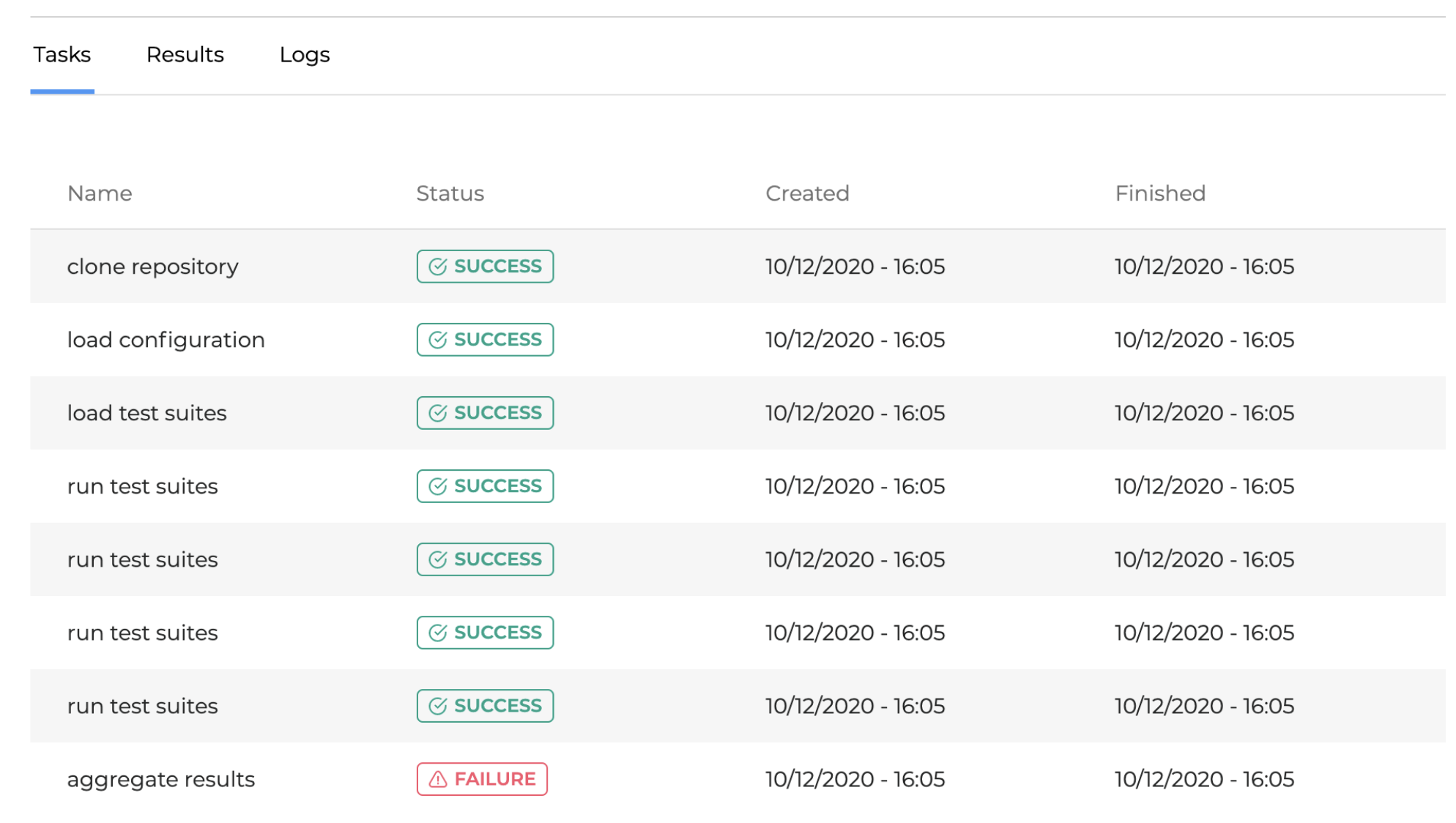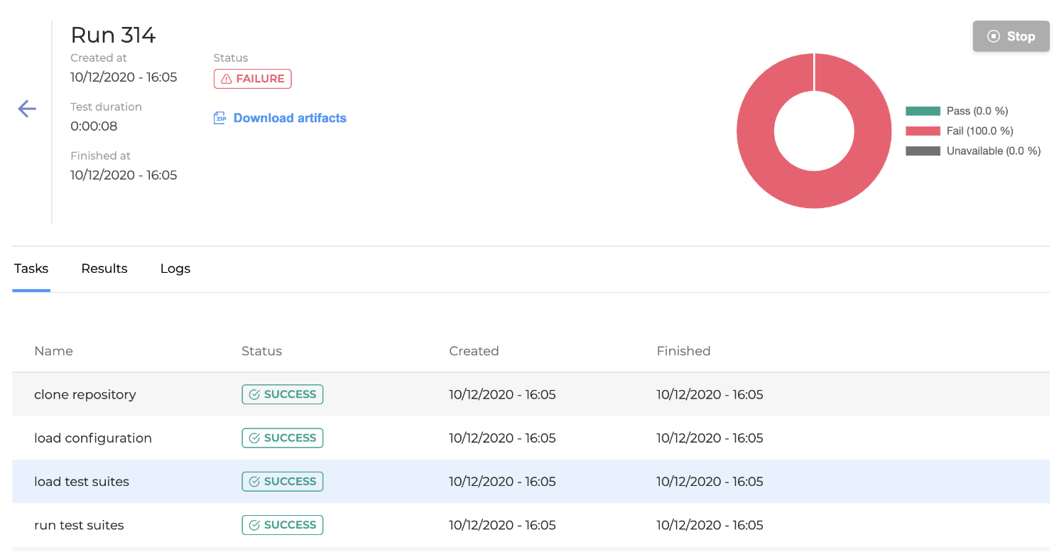Name: Tasks names performed during a test run. Each task has a detailed log which is available in the Logs tab. The following tasks are usually executed:
