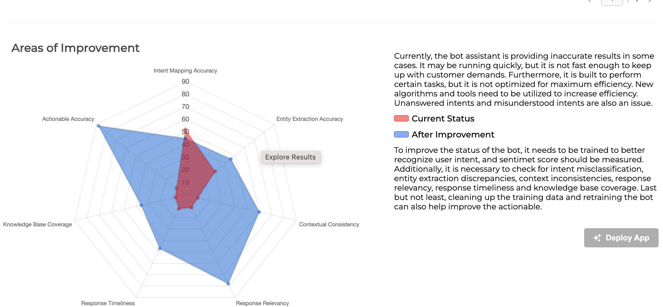 The Areas of Improvement chart delivers a report on areas where enhancements can be made to enrich your conversational experience. In the future, the user will be able to deploy an application that supports the areas of improvement that the tool has identified.