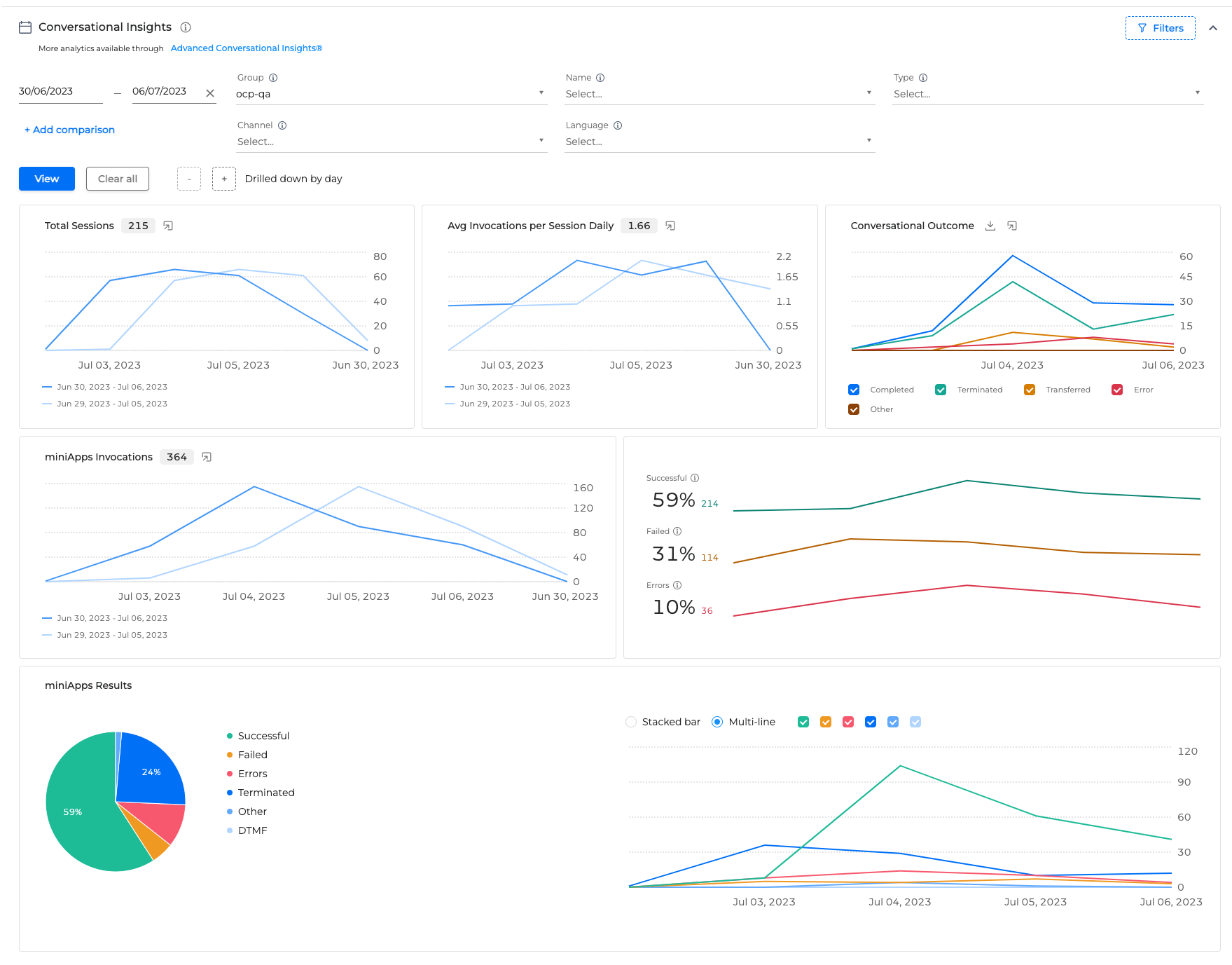 Conversational Insights offers a more analytical approach, providing historical performance metrics presented in a number of interactive dashboards, including Total Sessions, Avg Invocations, Conversational Outcome, miniApps Invocations and miniApps Results.