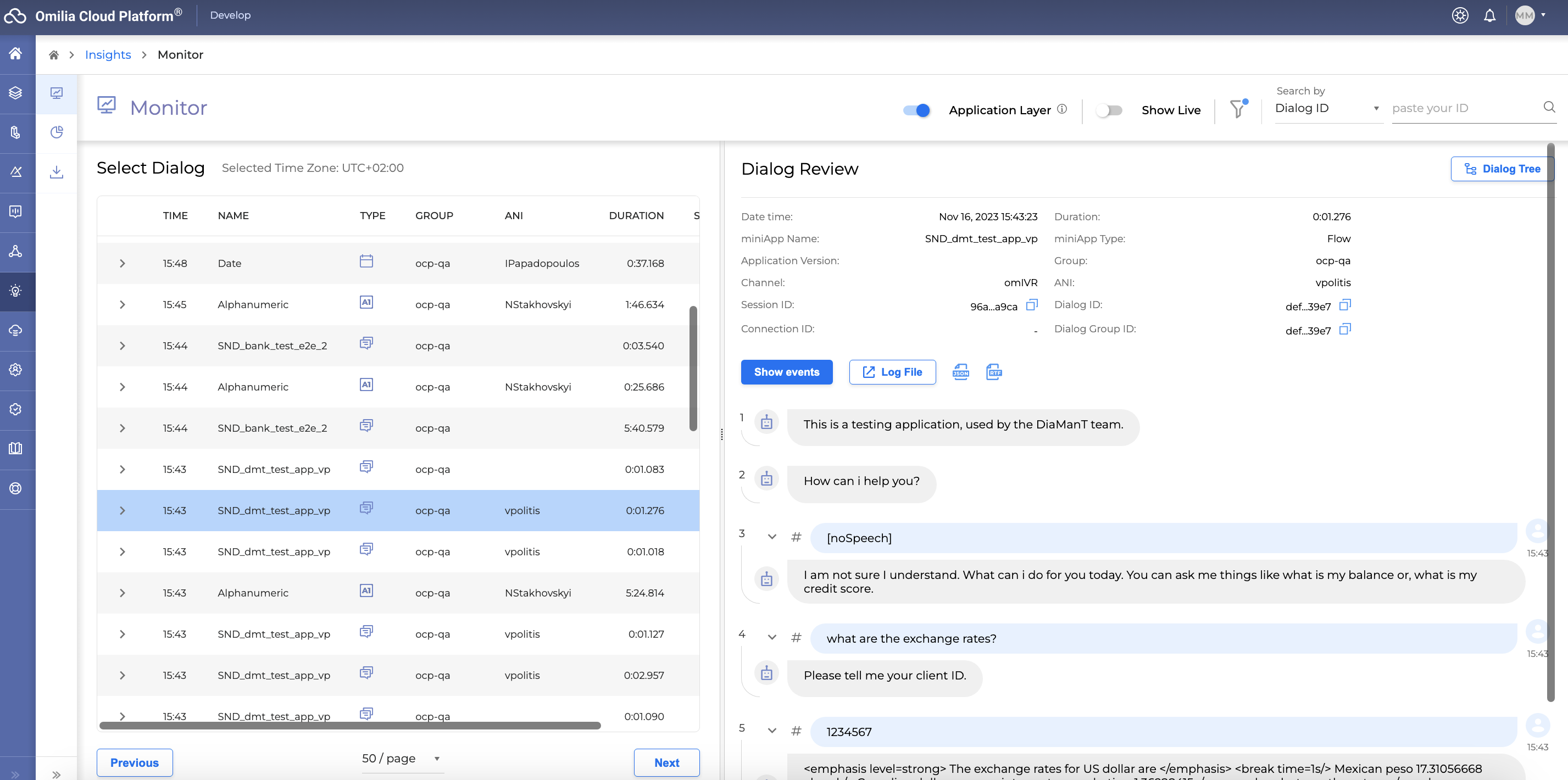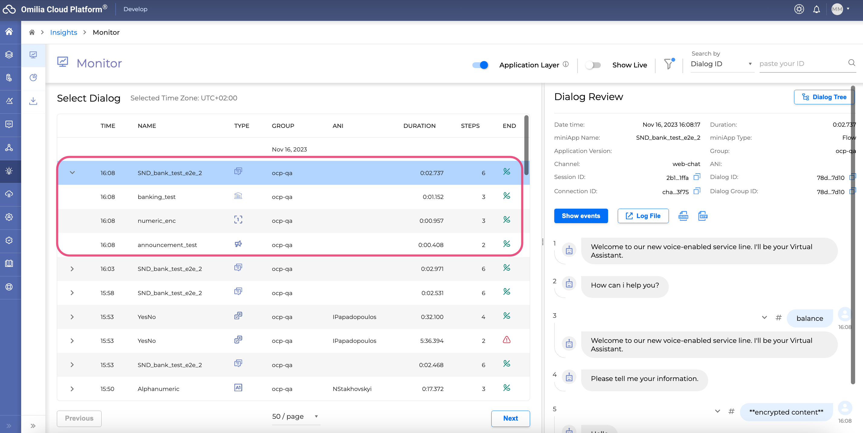 The OCP® Monitor is a comprehensive tool designed for tracking system-user interactions. With this tool, users can dive into conversational details within an OCP® application, examining Orchestrator application dialogues, Flow interactions, and miniApp invocations originating from calls or web chats.
