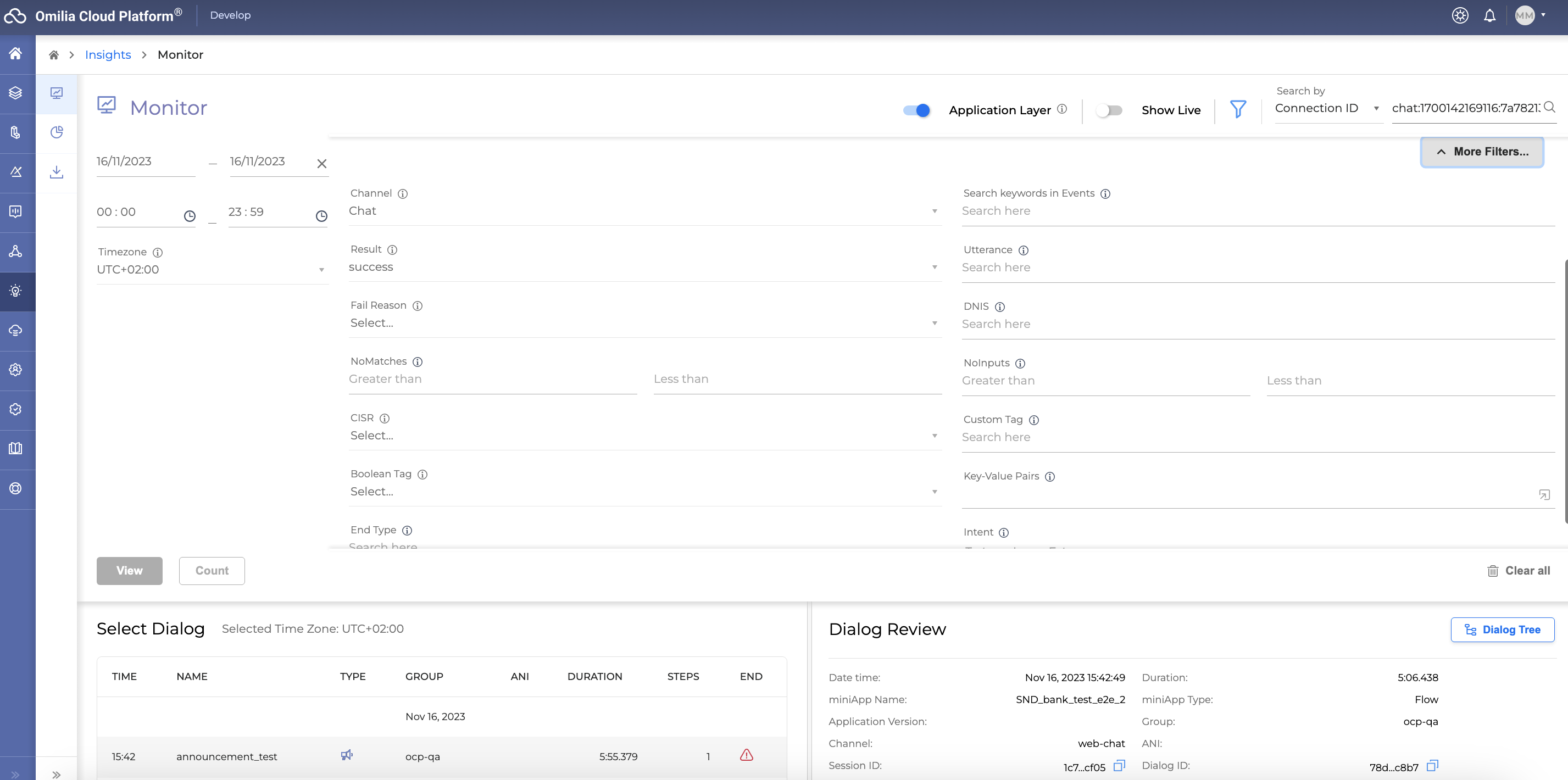 OCP® Monitor comes with a powerful search filter that lets users refine dialog search using filters like dialog ID, session ID, and connection ID. Live monitoring of ongoing sessions is also a feature via the Show Live toggle. Additionally, the Advanced Search provides more granular control over queries.