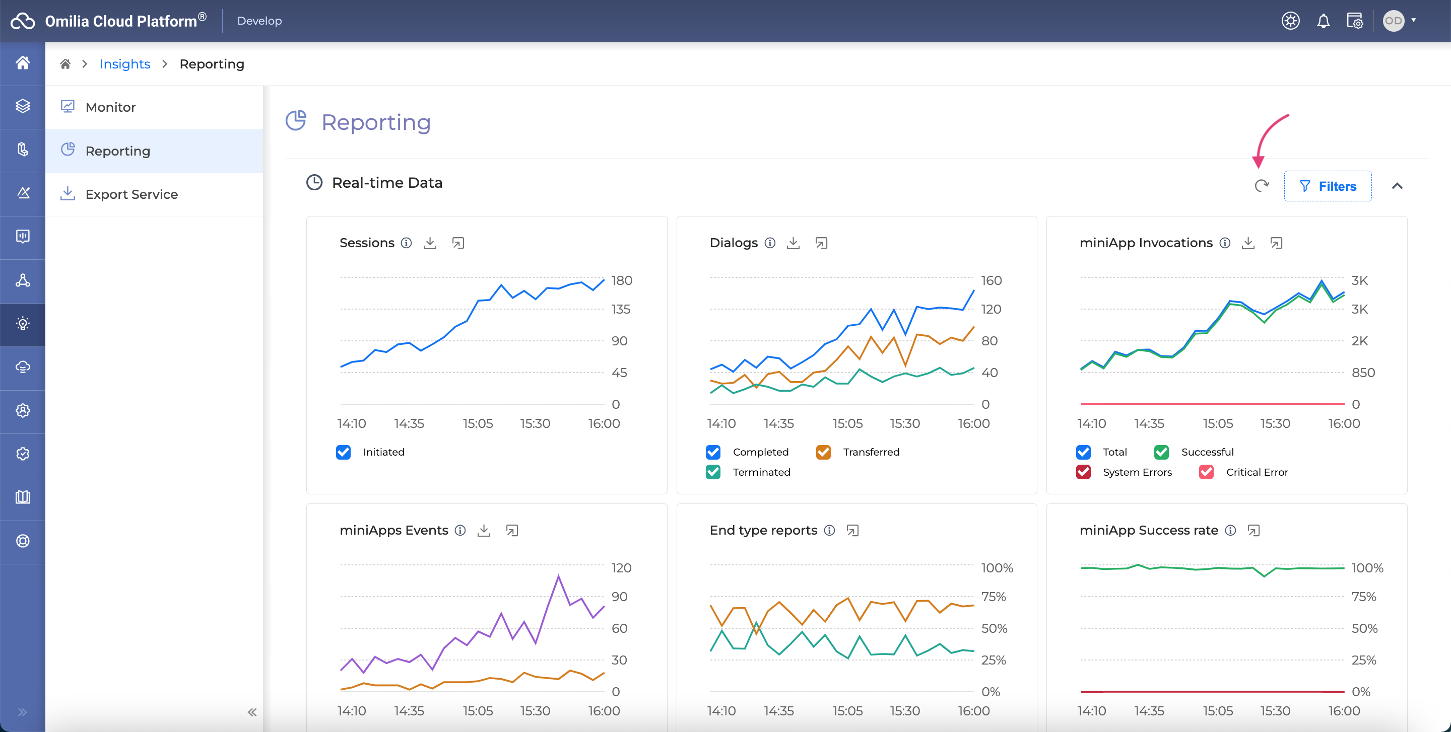 Real-time Data gives instantaneous updates on the current situation of miniApps, including Sessions, Dialogs, miniApp Invocations, miniApp Events, End Type Reports and miniApp Success Rate. This data can be filtered and downloaded for further analysis.