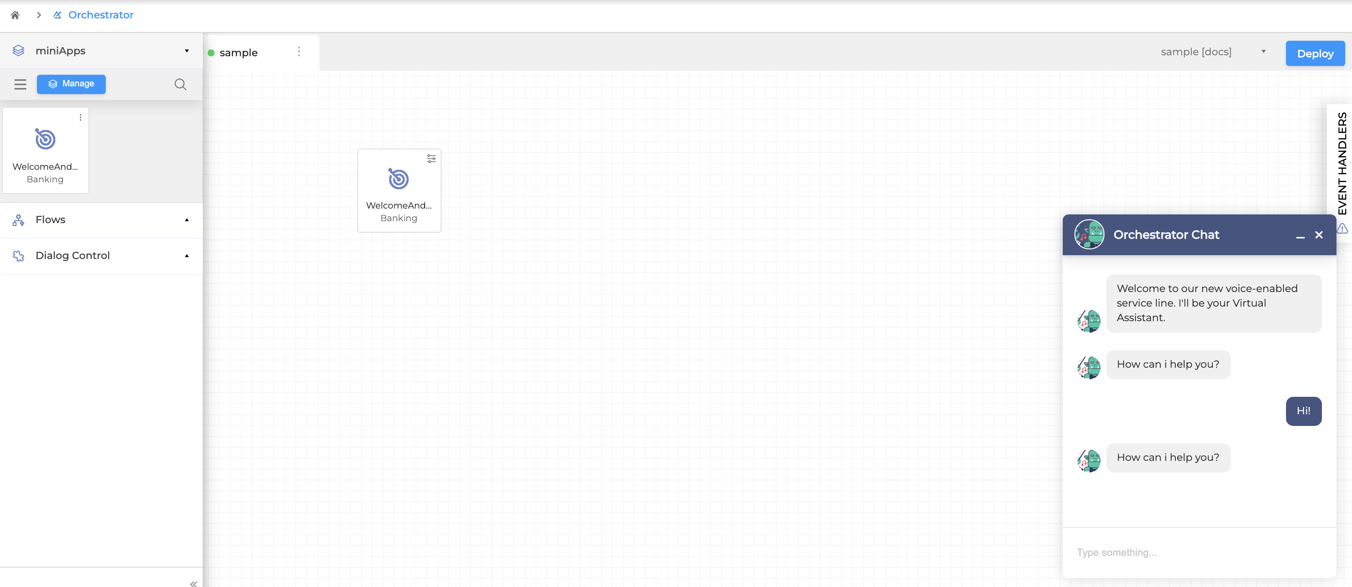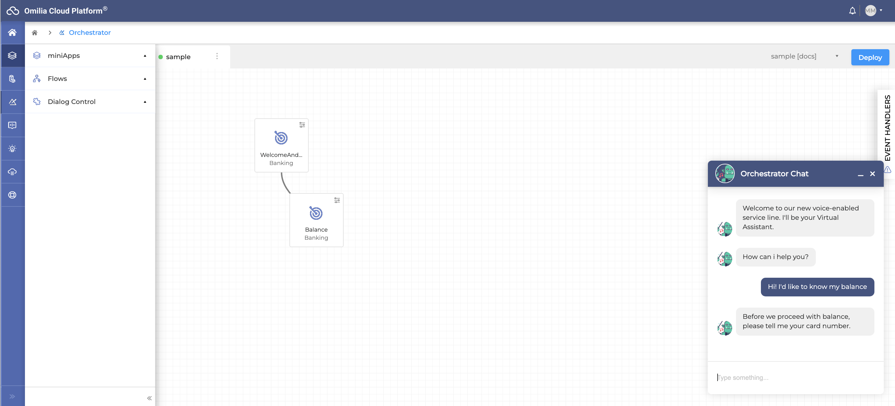 Even with only one miniApp bot placed on the canvas you can already try Orchestrator because you have a fully functional conversational AI bot that is able to pass and receive information from a customer. Click the Deploy button on the right, and then hit the Chat button on the lower right. You can easily notice in the dialog window that the conversation has begun!