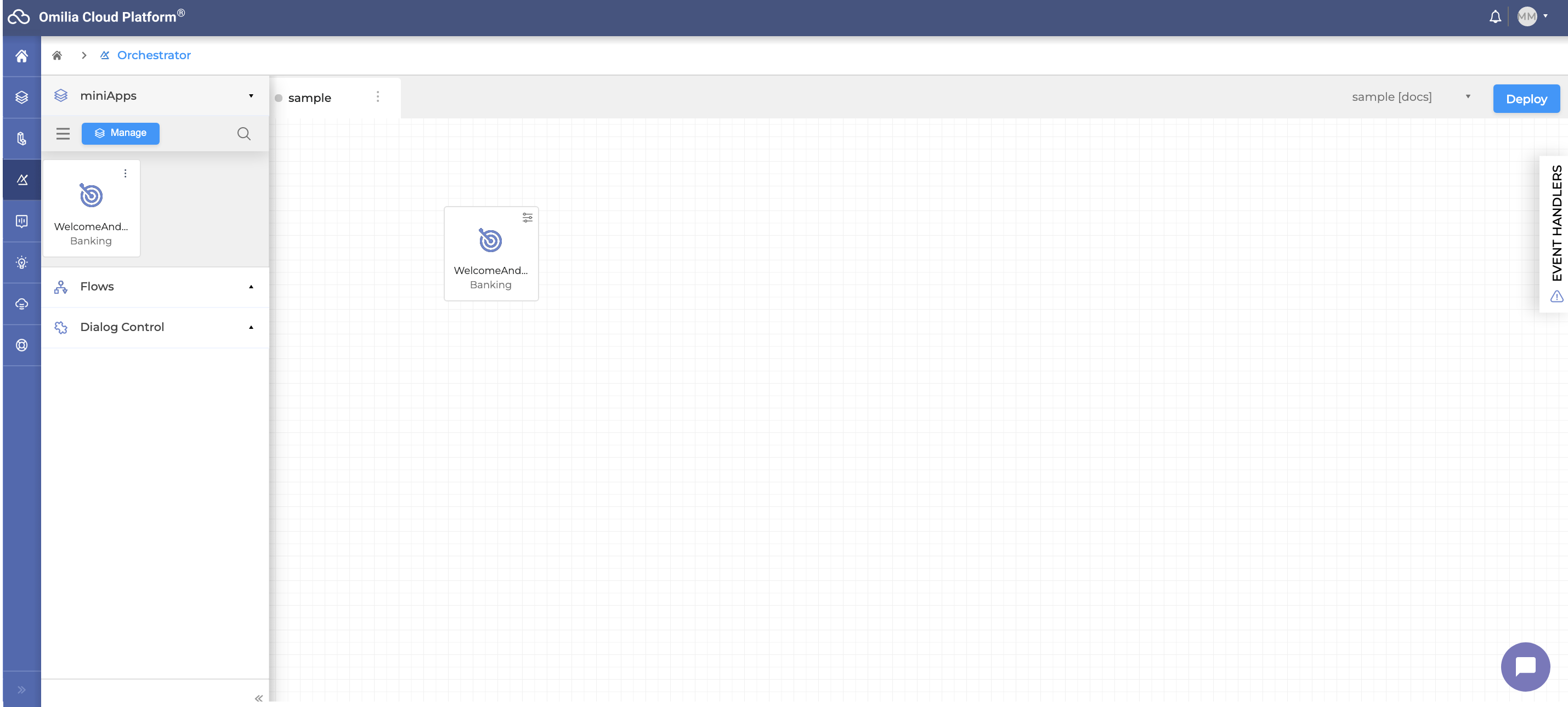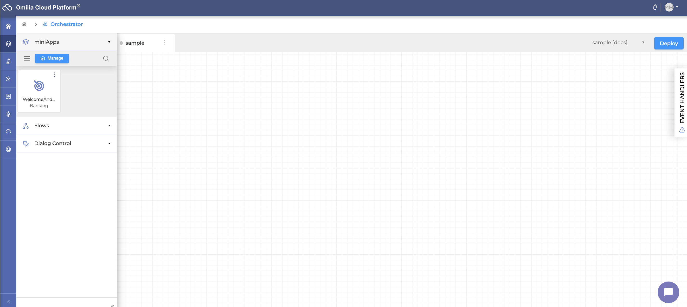 Drag and drop the miniApp you’ve created onto the canvas - this is a working area where you orchestrate the bots and other building blocks in order to build a complete conversation.
