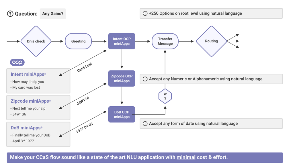 OCP miniApps® will dramatically reduce the complexity of developing and maintaining sophisticated speech-enabled conversational voice interfaces. There is no need to learn complicated tools and algorithms or to have extensive training in order to create best in class conversational speech automation that significantly improves customer experience and satisfaction. Due to reduced complexity, it would be very easy to make changes to an application flow with OCP miniApps® as compared to traditional systems. Furthermore, these sophisticated conversational virtual assistants can be deployed in a fraction of the time that other solutions take since these OCP miniApps® are pre-packaged natural language dialog components that only need to be brought into a CCaaS flow and configured.
