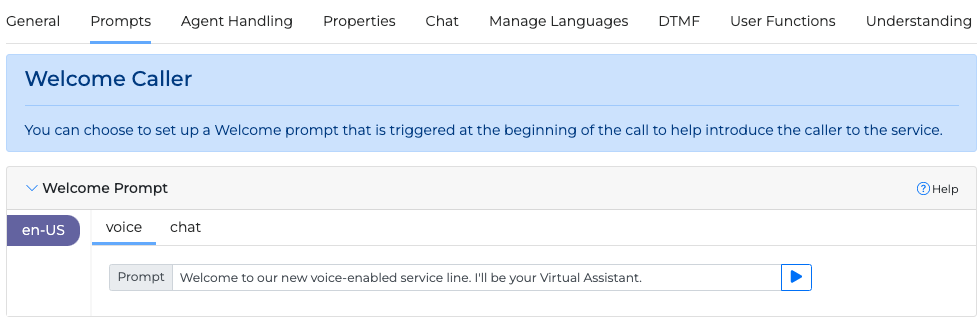 Here you can configure the initial welcome prompt that the customer will hear at the beginning of the call.
