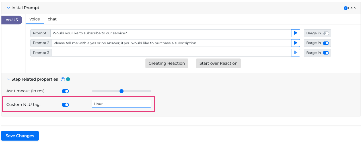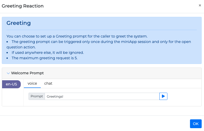 Sometimes, when prompted for input, a caller may first greet the application instead of giving the input directly. For these cases, it is possible to configure a Greeting Reaction, which will trigger in conjunction with the initial prompt resulting in a more human-like experience.