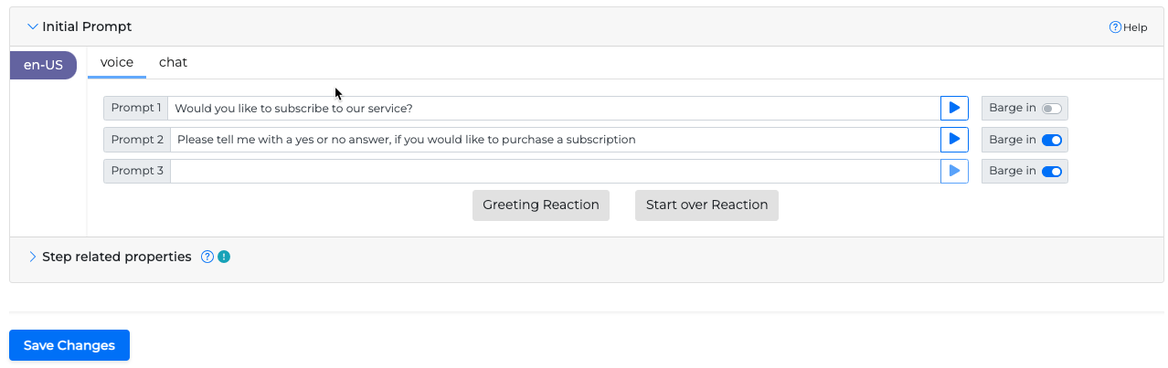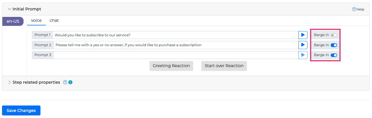 If you want to activate barge-in for each step, use the toggle on the right side of each initial prompt: