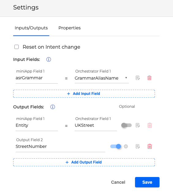 USStreet(en-US),DEStreet(de-DE) orUKStreet(en-GB) and optionalStreetNumber. Assign the field name used for the grammar name alias that was the output of your intelli miniApp (e.g.GrammarAliasName) to theasrGrammarminiApp input value as per the screenshot below:
